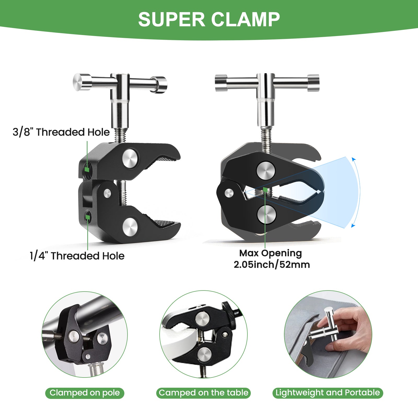 【Super Clamp】Super Clamp body is made of all-metal material with double threaded hole positions. Maximum opening is about 54MM. crab clamp with 1/4“ and 3/8” threaded holes on the back, it can be firmly fixed in a variety of places, such as cameras, lights, tables, tripods, etc. 3/8“ threaded port is suitable for large brackets such as heads, slides, etc. 1/4” threaded port is suitable for most of the equipment such as video light, set-top light, DSLR camera, cell phone clip and other 1/4 port equipment.